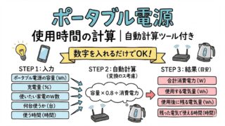 ポータブル電源の使用時間はどう計算する?容量と消費電力の考え方をやさしく解説。自動計算ツールで、我が家に必要な容量の目安がすぐ分かります。