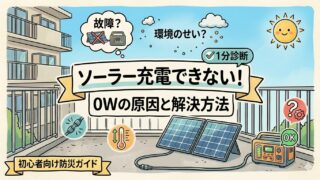 ポータブル電源がソーラー充電できない?0Wの原因を1分診断で確認。ケーブル・温度・影などよくある原因と対処法、本体やパネルの見分け方、問い合わせテンプレートまで解説。